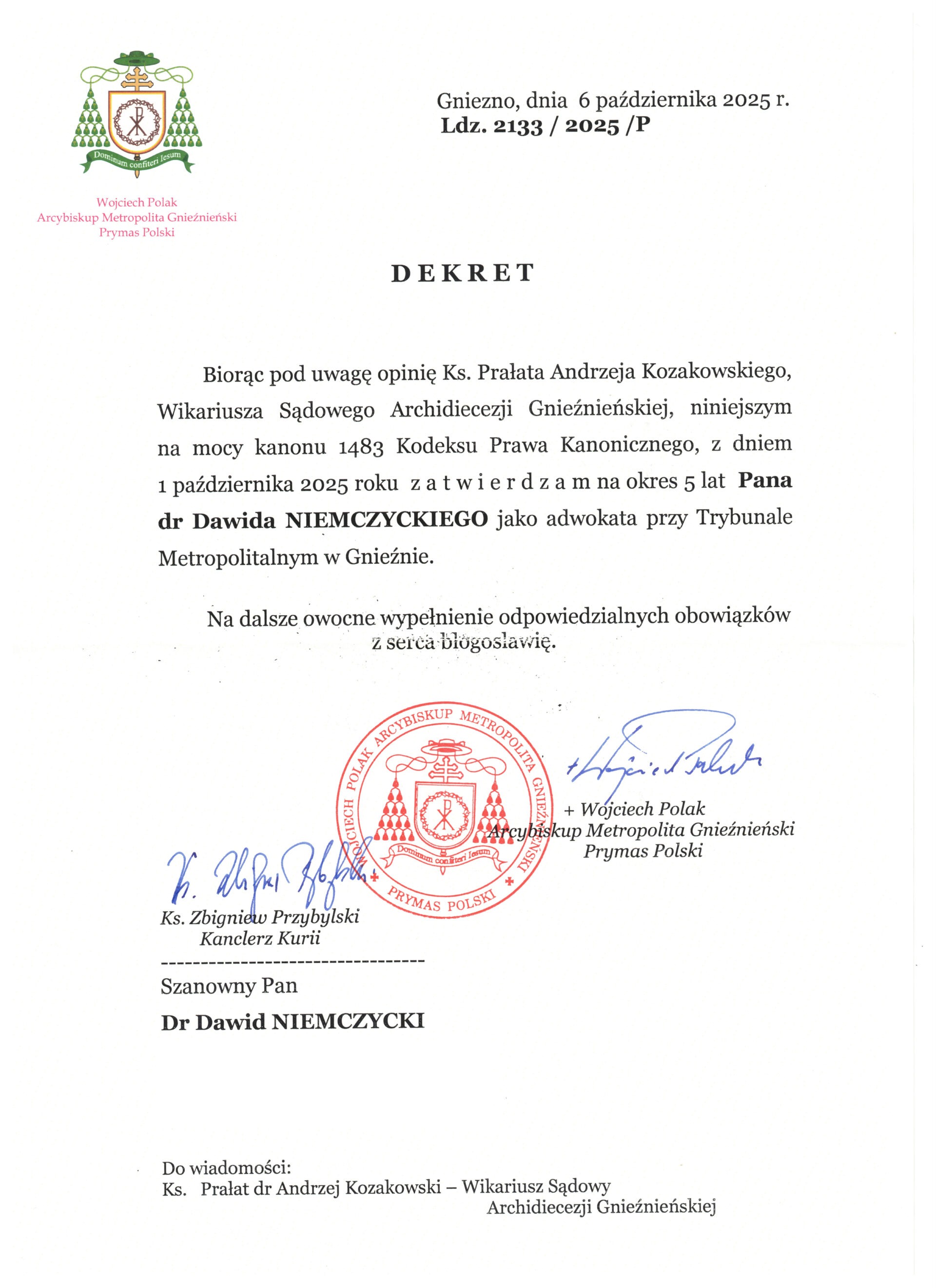 posiada uprawnienia oraz merytoryczną wiedzę do prowadzenia spraw o stwierdzenie nieważności małżeństwa. Potwierdzeniem tego jest m.in. ukończenie studiów podyplomowych Sądownictwo i administracja w Kościele.